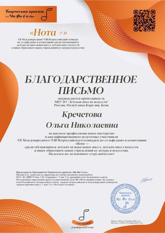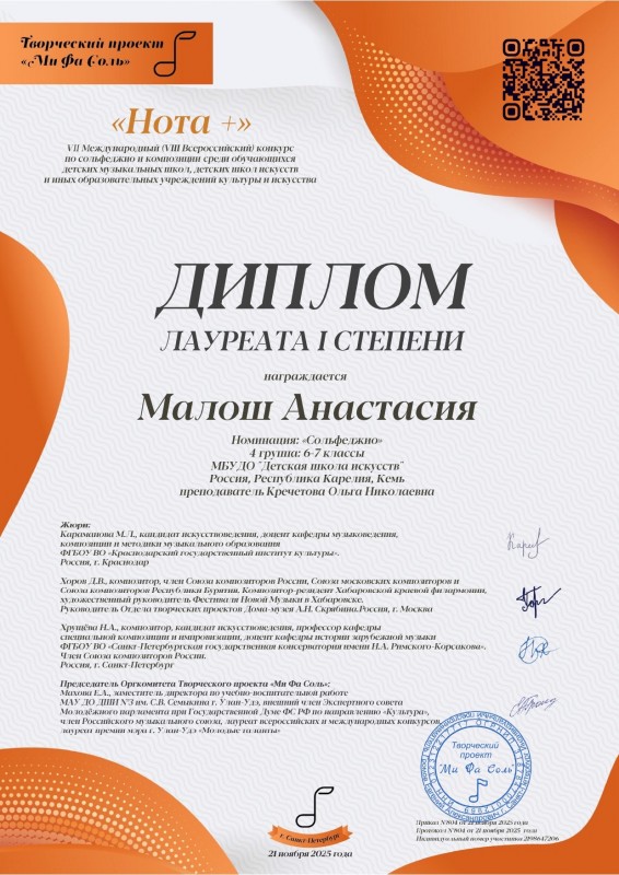 Малош Анастасия - Лауреат I степени VII Международного дистанционного конкурса по сольфеджио "Нота +", г. Санкт-Петербург. Преподаватель Заслуженный работник культуры РК Кречетова Ольга Николаевна.