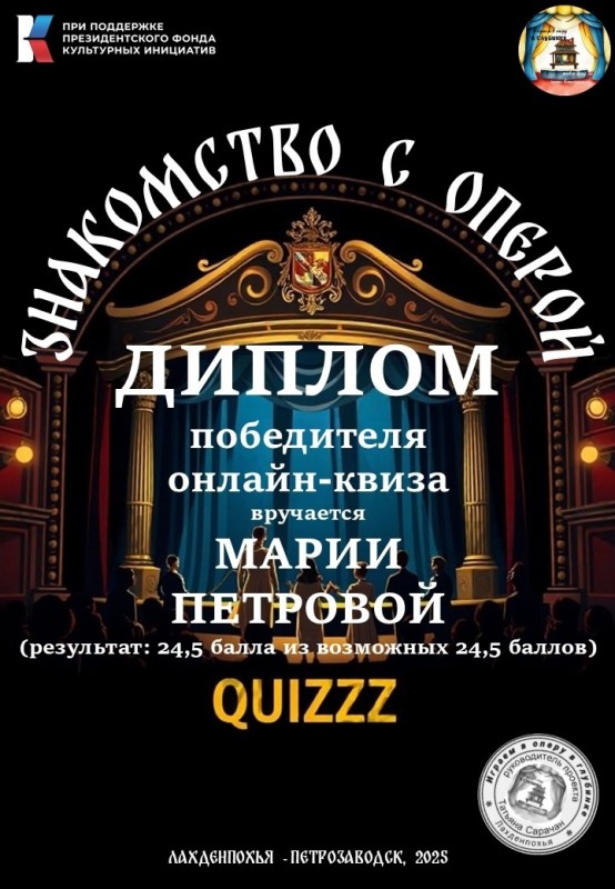 Поздравляем Марию Петрову, победителя онлайн - квиза «Знакомство с оперой». Познавательную викторину подготовила Вероника Бойкова - специалист отдела просвещения, ведущая концертов Карельской государственной филармонии. Так же Мария стала обладателем сувенирной кружки с логотипом проекта "Играем в оперу в глубинке". Проект реализуется при поддержке Президентского фонда культурных инициатив.