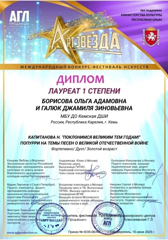 Борисова Ольга Адамовна и Галюк Джамиля Зиновьевна - Лауреат I степени Международного фестиваля-конкурса искусств «Арт-Звезда».