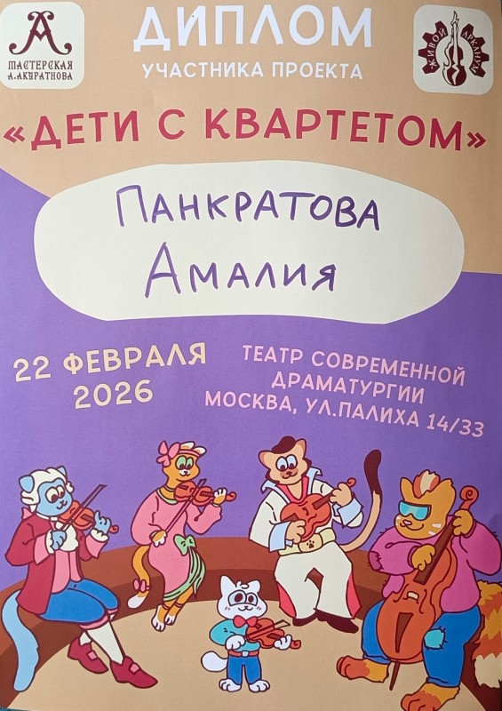 23 февраля 2026 года в Москве состоялся 3-й проект "Дети с квартетом". Организатор - преподаватель ДШИ №6 г. Балашиха, скрипичный мастер, художественный руководитель струнного квартета "Живой Арканум" Александр Акуратнов. Проект приобрёл большую популярность и собрал на сцене Театра современной драматургии юных скрипачей из Москвы, Пятигорска, Твери, Балабаново, Щелково, Подольска. Наш город, уже во второй раз, представила ученица 4 класса Панкратова Амалия. Вместе с квартетом «Живой Арканум» она исполнила пьесу Л. Обера «Тамбурин». Поздравляем Амалию с успешным выступлением и благодарим преподавателя Захарову А.В. и концертмейстера Борисову О.А. за подготовку, а так же родителей за организацию поездки.