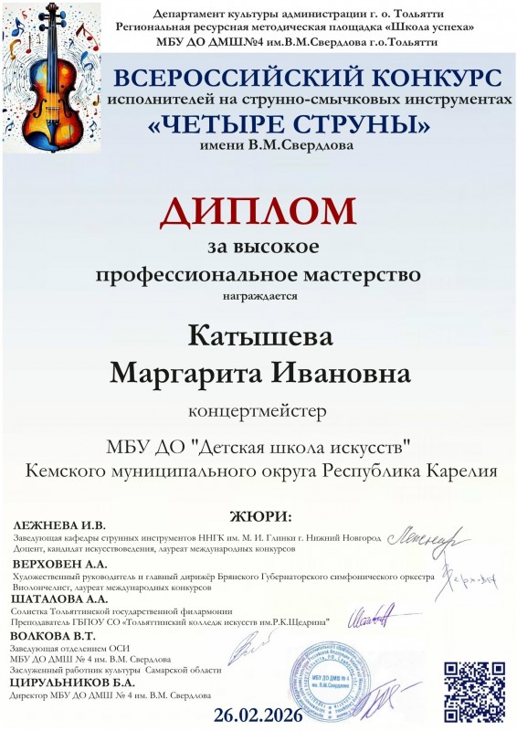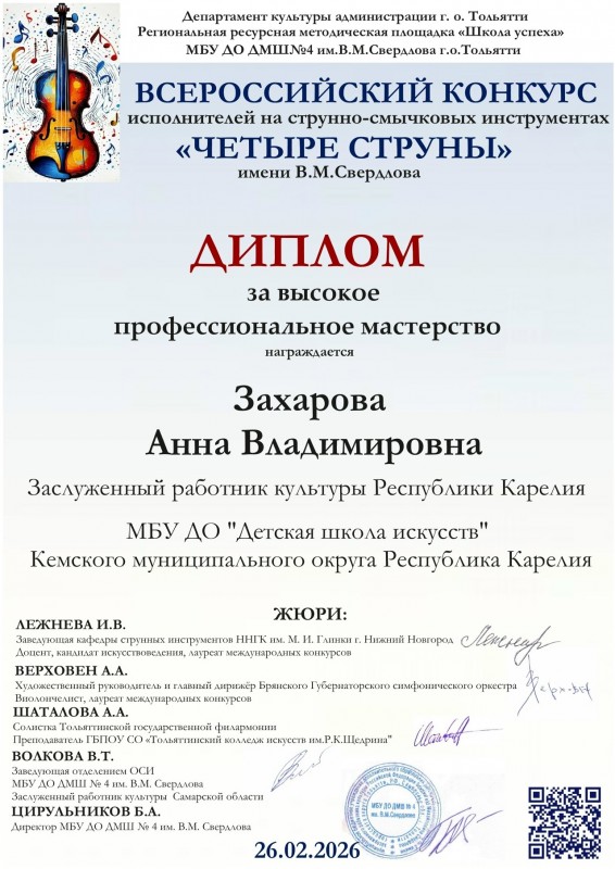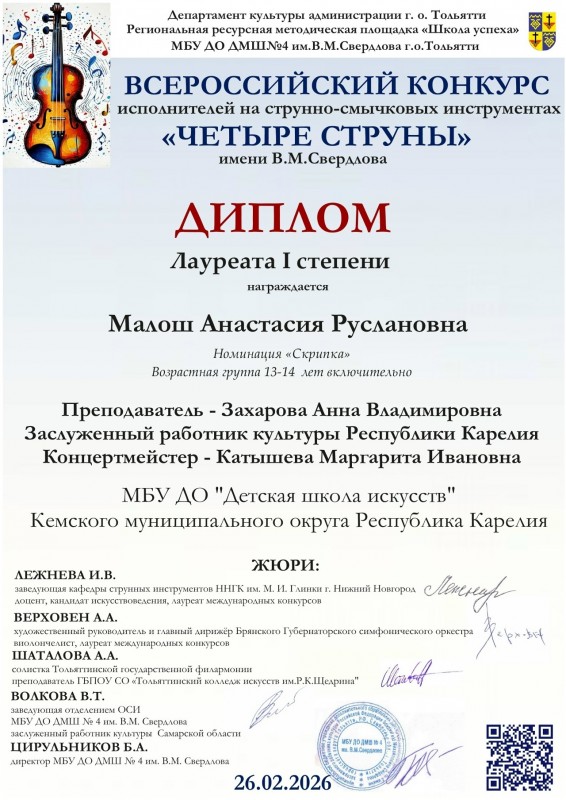 26 февраля 2026 года в г.о. Тольятти завершился Всероссийский онлайн-конкурс исполнителей на струнно - смычковых инструментах им. В.М. Свердлова «Четыре струны», в котором приняла участие учащаяся 7 класса отделения "Струнное" - Анастасия Малош. Конкурс посвящен Владимиру Михайловичу Свердлову - Заслуженному деятелю искусств РФ, талантливому скрипачу, основателю и руководителю ДМШ №4 г.о. Тольятти, а так же направлен на повышение уровня профессионального исполнительского мастерства и сохранение лучших традиций русской скрипичной школы. Конкурсантов оценивало высокопрофессиональное жюри в составе:
