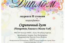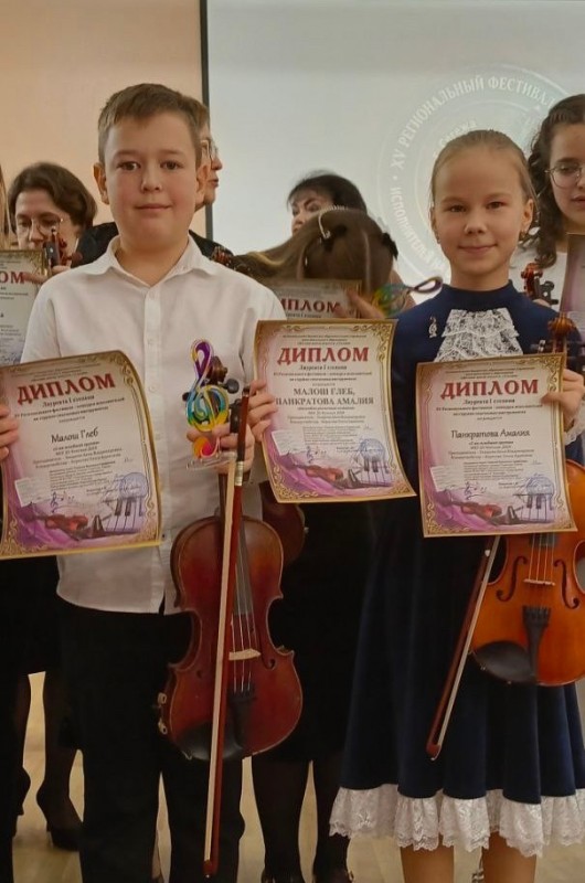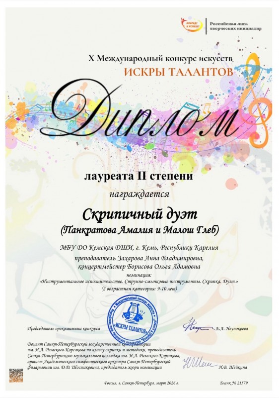 Поздравляем! Скрипичный дуэт - Панкратова Амалия и Малош Глеб - Лауреаты II степени X Международного дистанционного конкурса искусств "Искры талантов", г. Санкт-Петербург. Преподаватель Заслуженный работник культуры Республики Карелия Захарова Анна Владимировна, концертмейстер Борисова Ольга Адамовна.