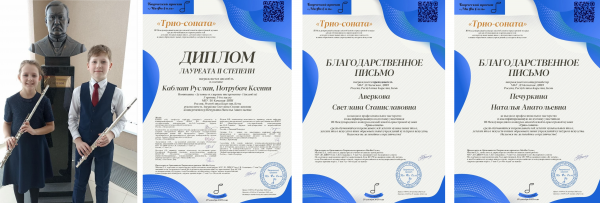 Ансамбль флейтистов в составе: Каблаш Руслан и Потрубач Ксения - Лауреат II степени III Международного дистанционного конкурса ансамблевой и оркестровой музыки "Трио - соната", г. Санкт-Петербург.
