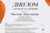 Малош Анастасия - Лауреат I степени VII Международного дистанционного конкурса по сольфеджио "Нота +", г. Санкт-Петербург. Преподаватель Заслуженный работник культуры РК Кречетова Ольга Николаевна.