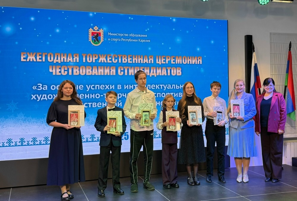 25 декабря 2025 года в Петрозаводске прошла ежегодная торжественная церемония чествования стипендиатов «За особые успехи в интеллектуальной, художественно-творческой, спортивной и общественной деятельности», утвержденная Министерством образования и спорта в целях поддержки творческих, интеллектуально развитых, активных, социально ответственных детей. В 2025 году на рассмотрение экспертного совета поступила 91 заявка из 16 муниципальных образований республики в номинациях: