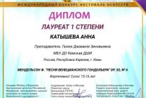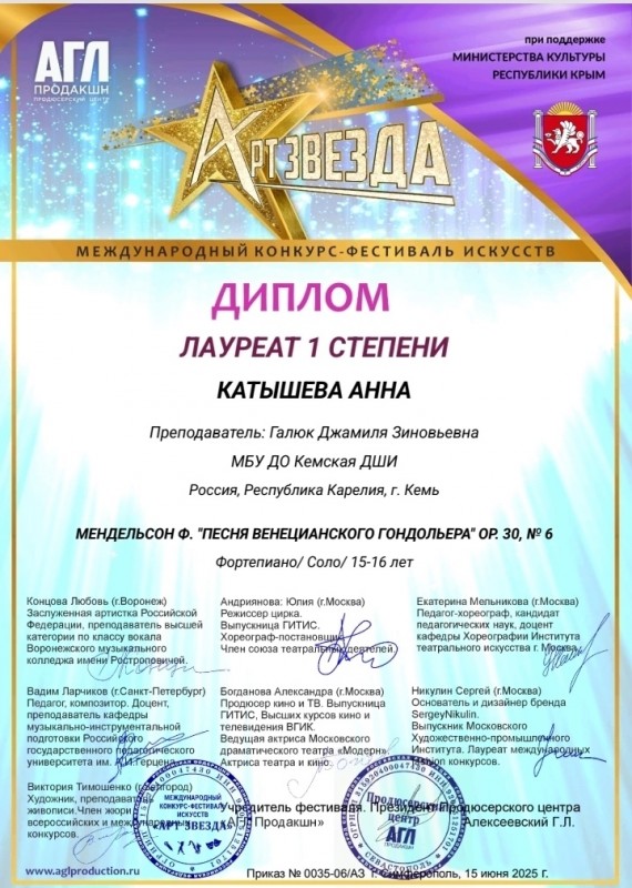 Катышева Анна - выпускница 2025 года отделения «Фортепиано» стала лауреатом I степени Международного конкурса-фестиваля искусств АРТ ЗВЕЗДА.Комментарий председателя жюри Вадима Ларчикова (Санкт-Петербург) в жанре номера: Мендельсон Ф. "Песня венецианского гондольера" ор. 30, № 6 - Анна демонстрирует отличное чувство стиля исполняемой музыки, игра ее органична, качественный звук. Преподаватель Галюк Джамиля Зиновьевна.