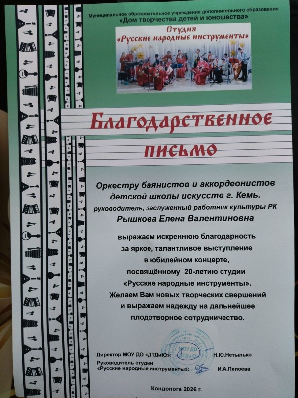 28 февраля 2026 года на сцене ДТДиЮ г. Кондопоги состоялся концерт, посвященный 20-летию студии «Русские народные инструменты», в котором принял участие Оркестр баянистов и аккордеонистов Кемской ДШИ.С Кондопожским оркестром русских народных инструментов нас связывают теплые, творческие отношения. В 2024 году на сцене Дома творчества г. Кеми мы выступали в совместном концерте «Виват, оркестр!», и когда получили приглашение принять участие в юбилейном концерте в г. Кондопога, не сомневались - надо ехать! Так же, своими музыкальными номерами Кондопожский ОРНИ поздравили оркестр Кондопожской ДШИ "Музыкальный сувенир" (руководитель Сторожко О.И.) и оркестр русских народных инструментов Петрозаводской музыкальной школы им.Г.Синисало (руководитель Городничин Д.В).Мы благодарим коллектив ДТДиЮ г. Кондопоги за тёплый приём и отличную организацию мероприятия.Студии «Русские народные инструменты» (руководитель Пепоева И.А.) от души желаем творческих успехов и процветания. Ждём к нам в гости!Руководитель Оркестра баянистов и аккордеонистов, Заслуженный работник культуры РК Рышкова Елена Валентиновна.